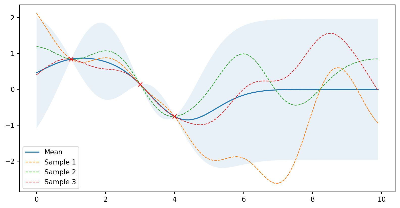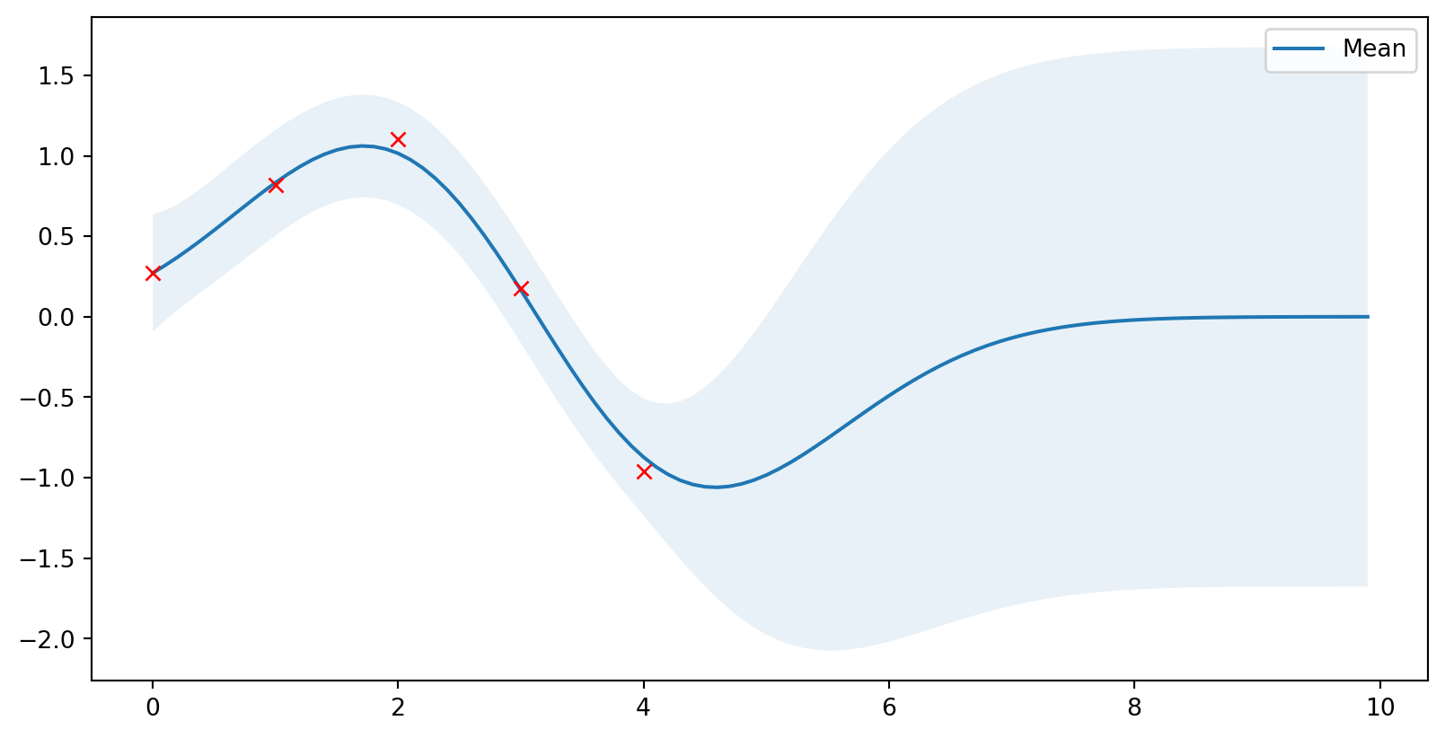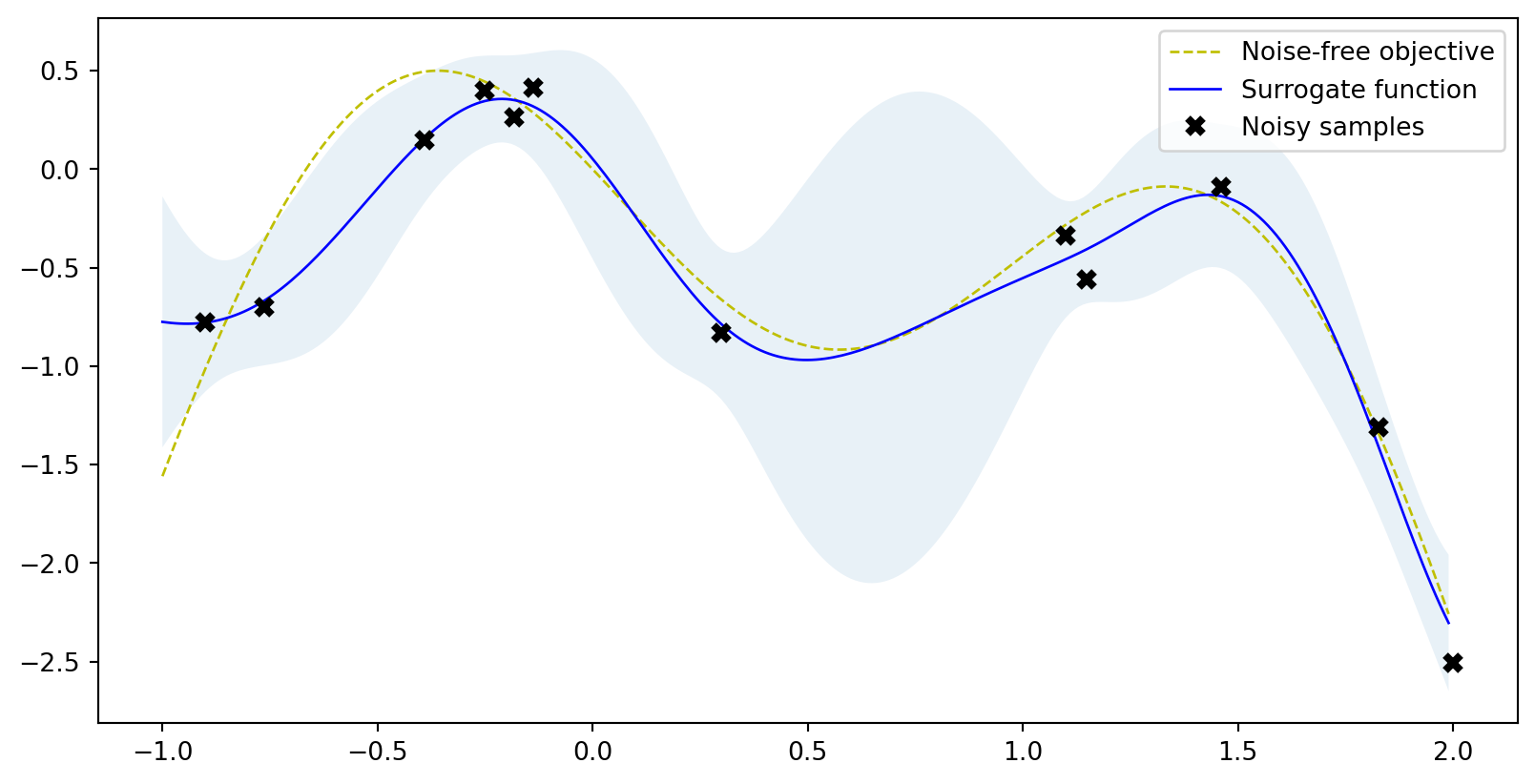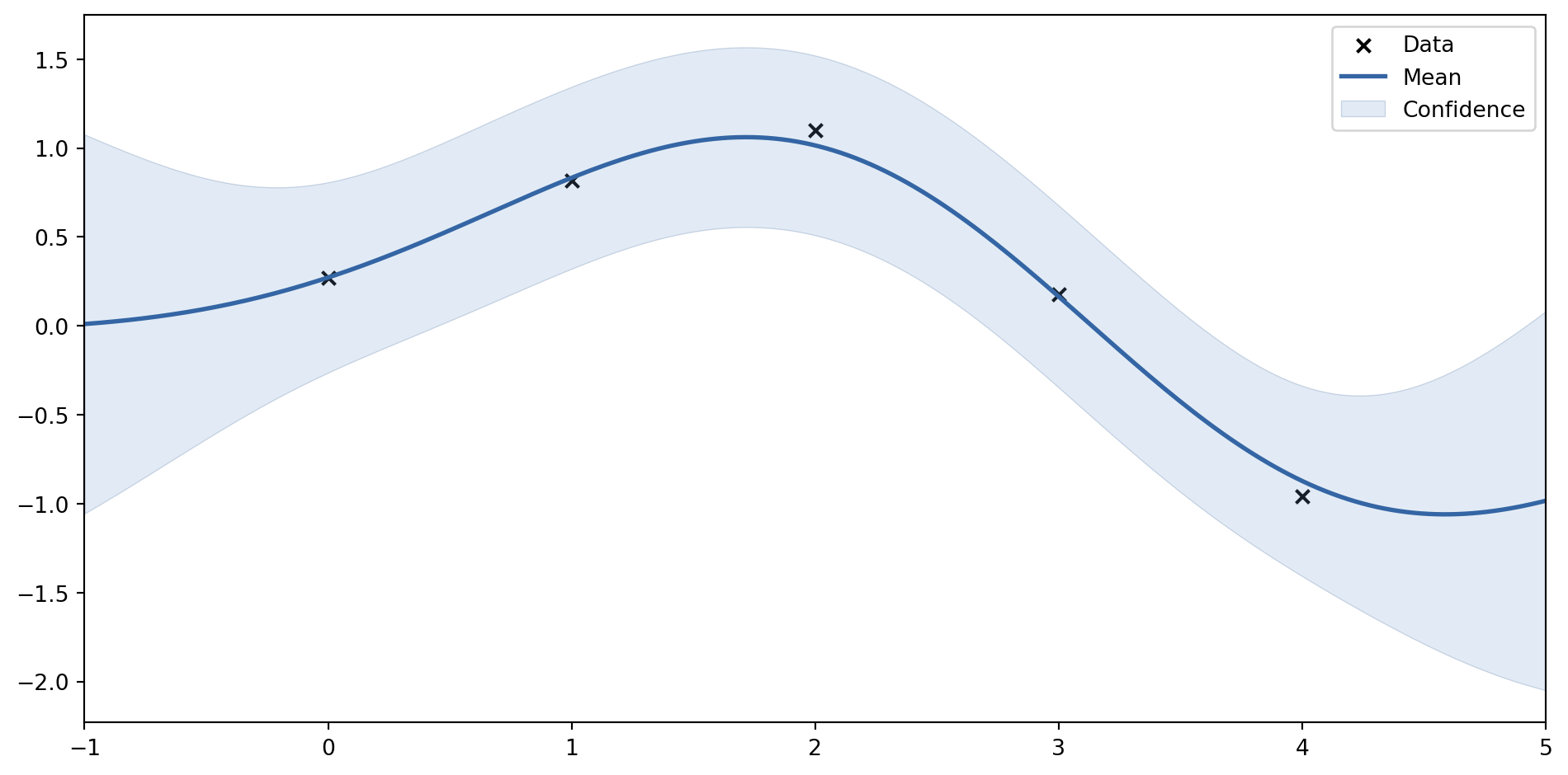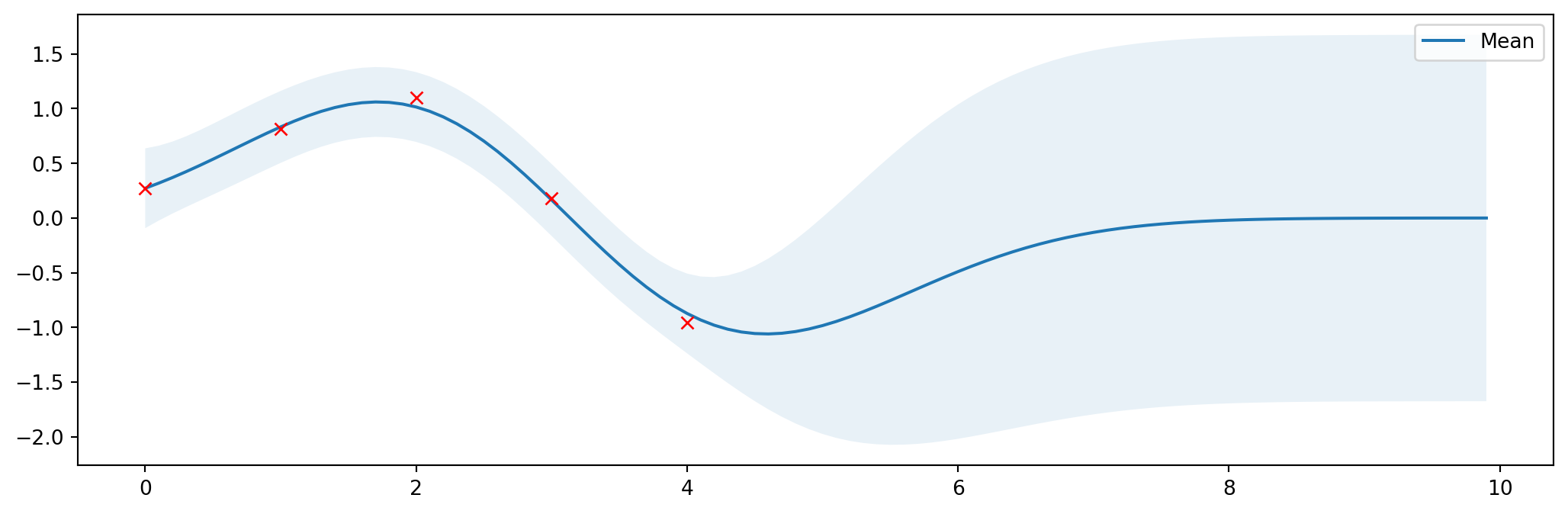 from numpy.linalg import cholesky, detfrom scipy.linalg import solve_triangularfrom scipy.optimize import minimizedef nll_fn(X_train, Y_train, noise, naive=True):""" Returns a function that computes the negative log marginal likelihood for training data X_train and Y_train and given noise level. Args: X_train: training locations (m x d). Y_train: training targets (m x 1). noise: known noise level of Y_train. naive: if True use a naive implementation of Eq. (11), if False use a numerically more stable implementation. Returns: Minimization objective. """ Y_train = Y_train.ravel()def nll_naive(theta):# Naive implementation of Eq. (11). Works well for the examples # in this article but is numerically less stable compared to # the implementation in nll_stable below. K = kernel(X_train, X_train, l=theta[0], sigma=theta[1]) +\ noise**2* np.eye(len(X_train))return0.5* np.log(det(K)) +\0.5* Y_train.dot(inv(K).dot(Y_train)) +\0.5*len(X_train) * np.log(2*np.pi)def nll_stable(theta):# Numerically more stable implementation of Eq. (11) as described# in http://www.gaussianprocess.org/gpml/chapters/RW2.pdf, Section# 2.2, Algorithm 2.1. K = kernel(X_train, X_train, l=theta[0], sigma=theta[1]) +\ noise**2* np.eye(len(X_train)) L = cholesky(K) S1 = solve_triangular(L, Y_train, lower=True) S2 = solve_triangular(L.T, S1, lower=False)return np.sum(np.log(np.diagonal(L))) +\0.5* Y_train.dot(S2) +\0.5*len(X_train) * np.log(2*np.pi)if naive:return nll_naiveelse:return nll_stable# Minimize the negative log-likelihood w.r.t. parameters l and sigma_f.# We should actually run the minimization several times with different# initializations to avoid local minima but this is skipped here for# simplicity.res = minimize(nll_fn(X_train, Y_train, noise), [1, 1], bounds=((1e-5, None), (1e-5, None)), method='L-BFGS-B')# Store the optimization results in global variables so that we can# compare it later with the results from other implementations.l_opt, sigma_f_opt = res.x# Compute posterior mean and covariance with optimized kernel parameters and plot the resultsmu_s, cov_s = posterior(X, X_train, Y_train, l=l_opt, sigma=sigma_f_opt, sigma_y=noise)plt.figure(figsize=(13, 4))plot_gp(mu_s, cov_s, X, X_train=X_train, Y_train=Y_train)