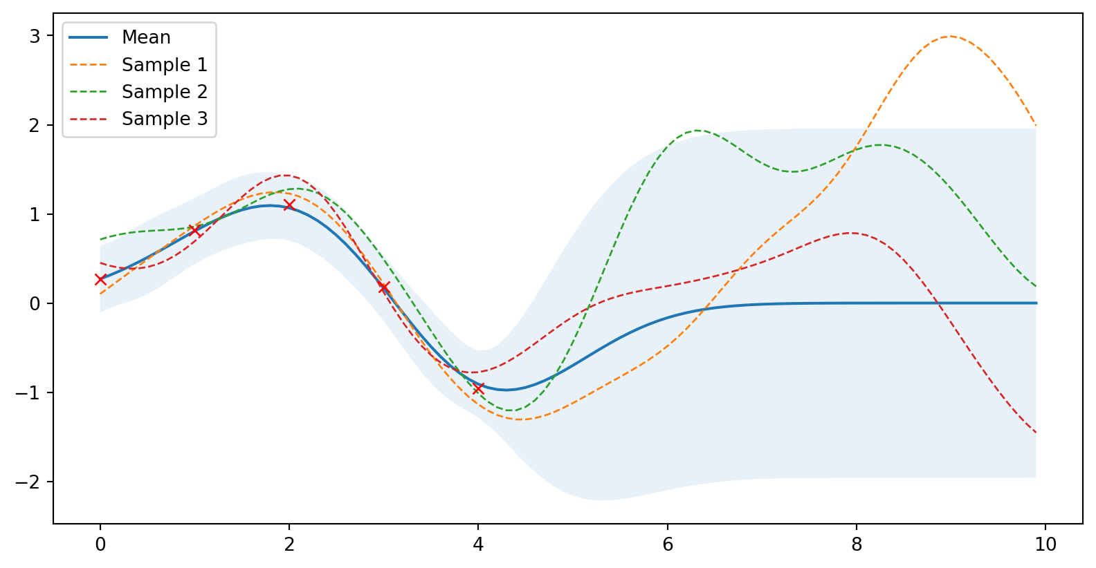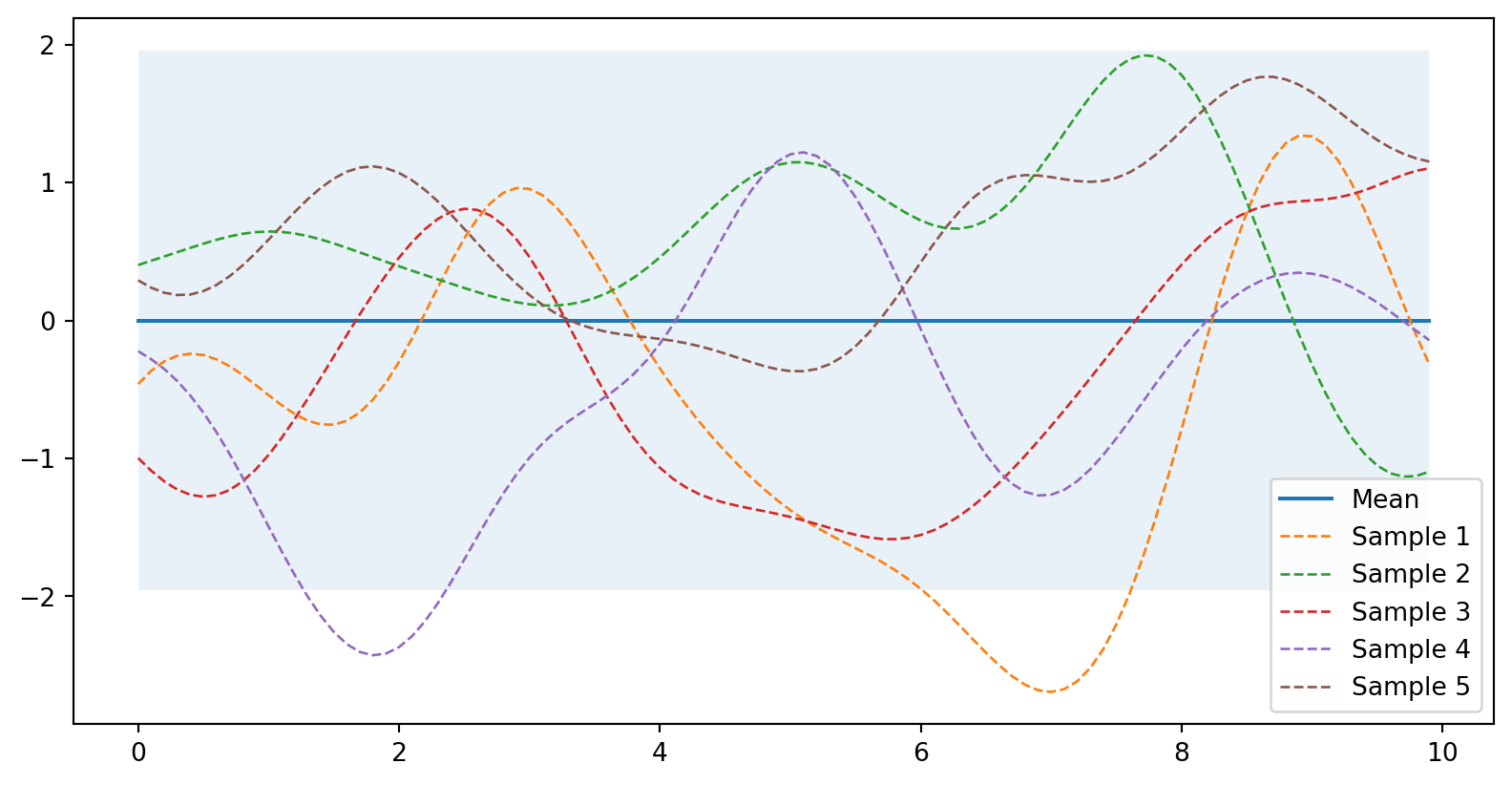 from helper import plot_gp# Vygeneruji body (konečný počet)X = np.arange(0, 10, 0.1).reshape(-1, 1) #počet sloupců dopočítámu = np.zeros(X.shape) # střední hodnotacov = kernel(X, X) # spočtu kovarianci (nenormovaná korelace)# Vygeneruji 5 funkcí jako výsledek náhodného gaussovského procesusamples = np.random.multivariate_normal(mu.ravel(), cov, 5)# Vykreslí střední hodnotu, oblast nejistoty a funkce plot_gp(mu, cov, X, samples=samples)