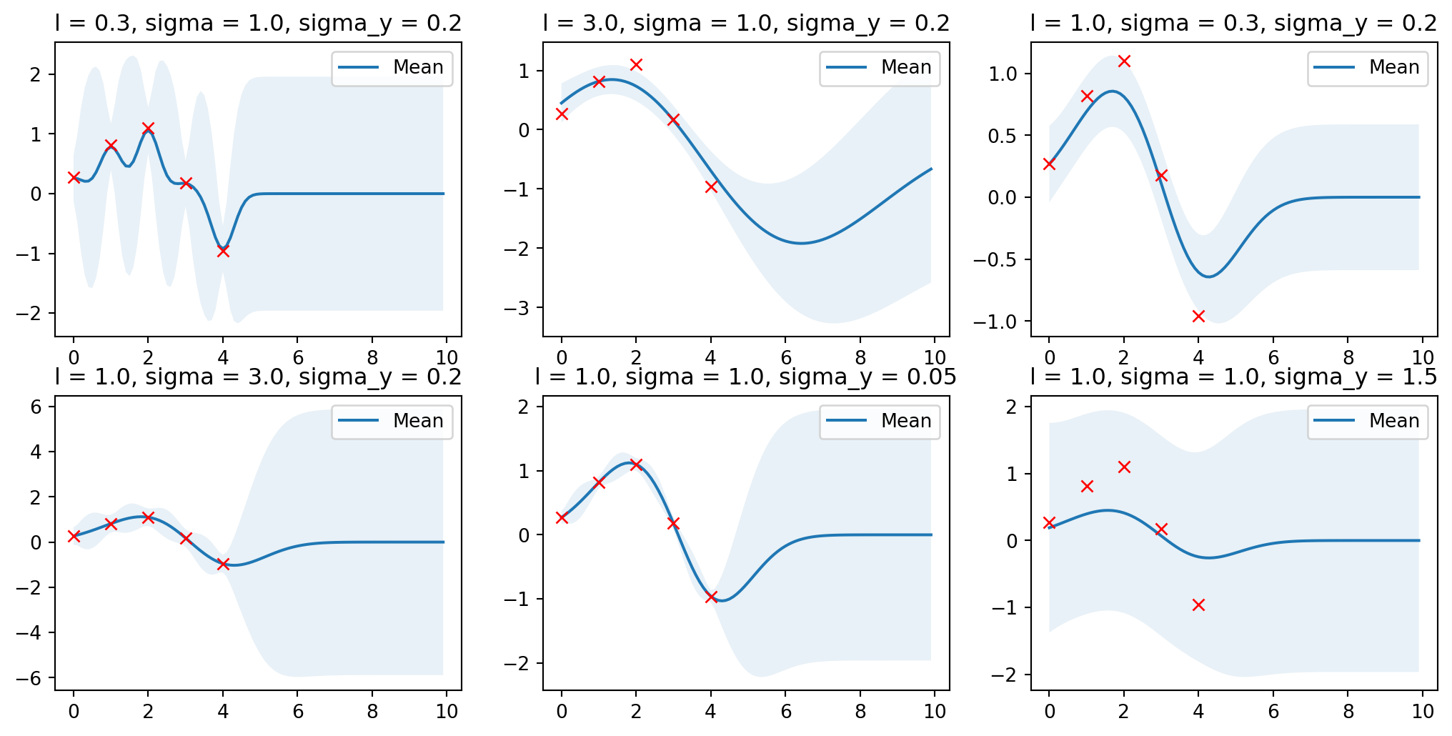 from numpy.linalg import invdef posterior(X, X_train, Y_train, l=1.0, sigma=1.0, sigma_y=1e-8):""" Spočítá novou střední hodnotu a kovarianci při znalosti train dat Args: X: osa x X_train, Y_train: známá data (m x 1) l, sigma: Parametry jádra sigma_y: šum Returns: Posterior střední hodnota (n x d) a kovariance (n x n). """ K = kernel(X_train, X_train, l, sigma) + sigma_y**2* np.eye(len(X_train)) # jádro s šumem K_s = kernel(X_train, X, l, sigma) K_ss = kernel(X, X, l, sigma) +1e-8* np.eye(len(X)) mu_s = K_s.T.dot(inv(K)).dot(Y_train) # (7) cov_s = K_ss - K_s.T.dot(inv(K)).dot(K_s) # (8)return mu_s, cov_s