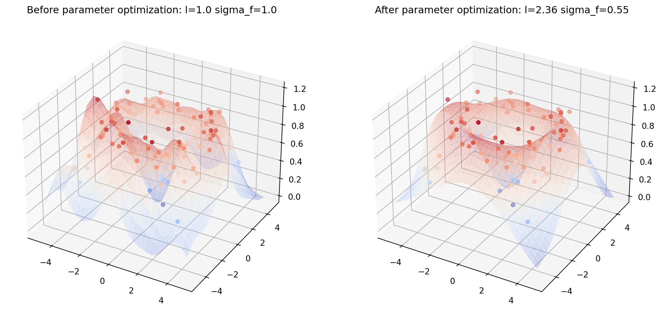 import numpy as npdef kernel(X1, X2, l=1.0, sigma=1.0):""" Isotropic squared exponential kernel. Args: X1,2: Array of m points (m x d). X2: Array of n points (n x d). Returns: (m x n) matrix. """ sqdist = np.sum(X1**2, 1).reshape(-1, 1) + np.sum(X2**2, 1) -2* np.dot(X1, X2.T)return sigma**2* np.exp(-0.5/ l**2* sqdist)